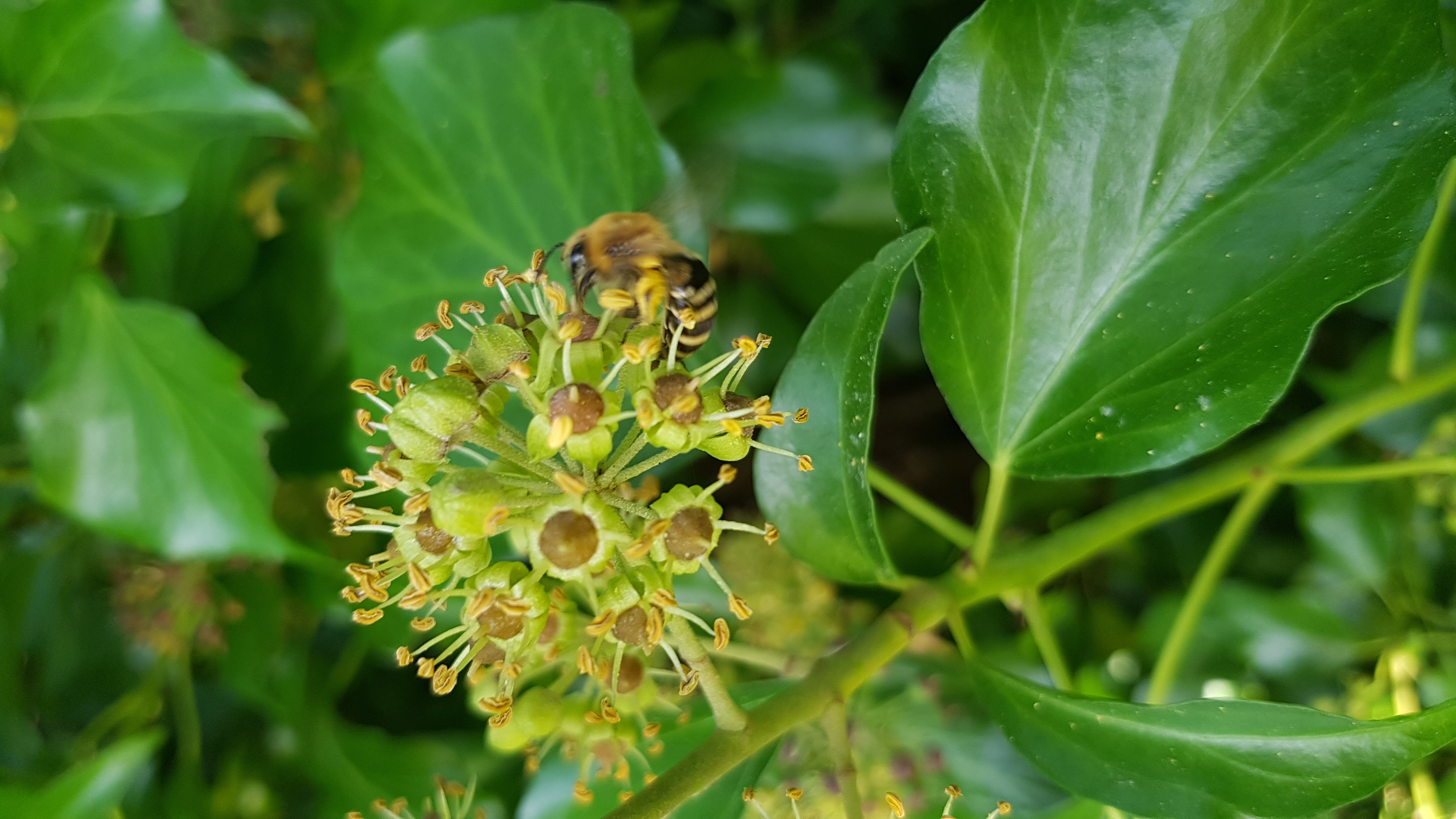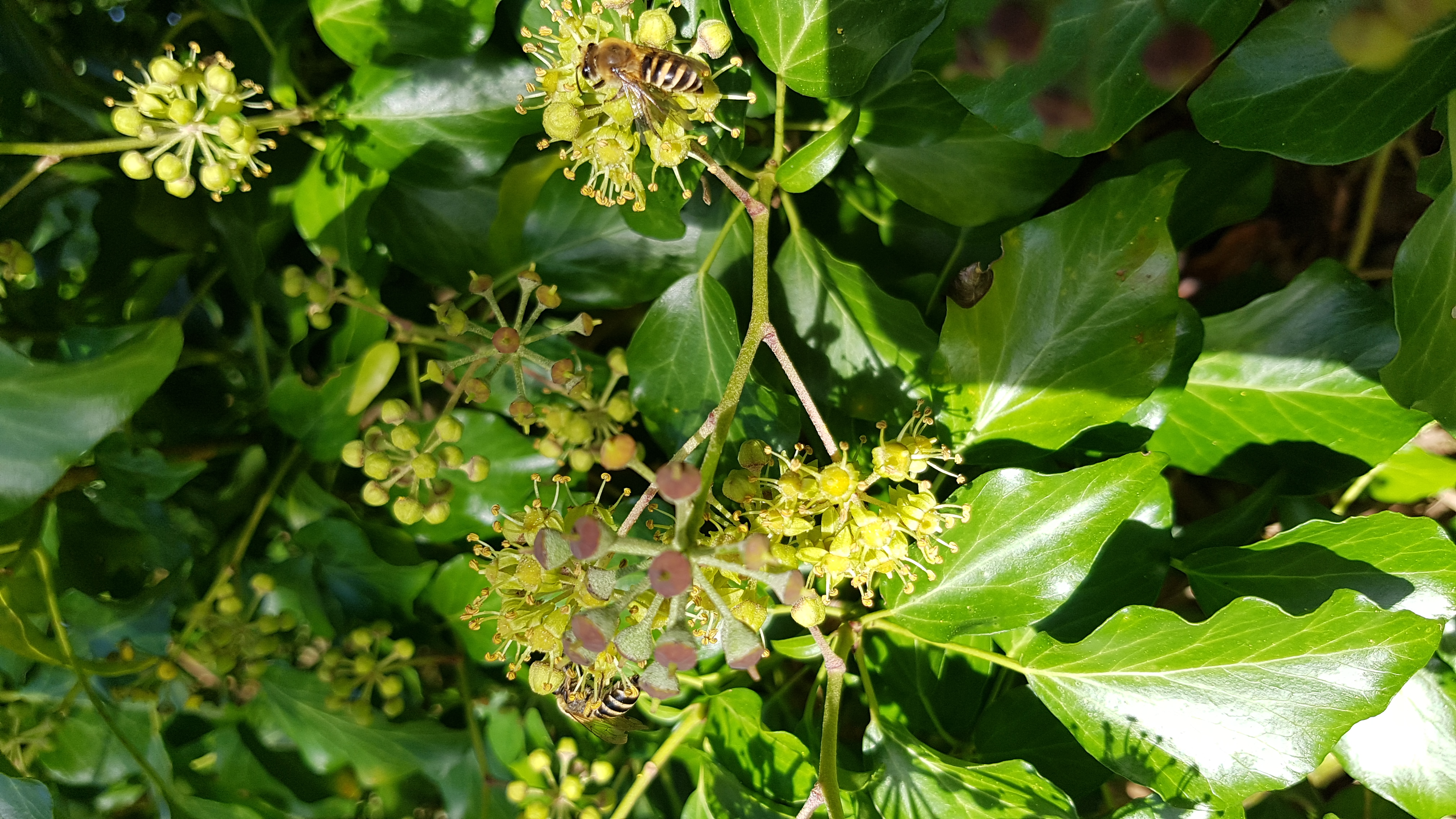 Il s’agit du lierre en fleurs, véritable attraction pour tous les butineurs du moment. En cette période de l’année, il fait l’unanimité chez les abeilles, les guêpes et bien d’autres pollinisateurs.