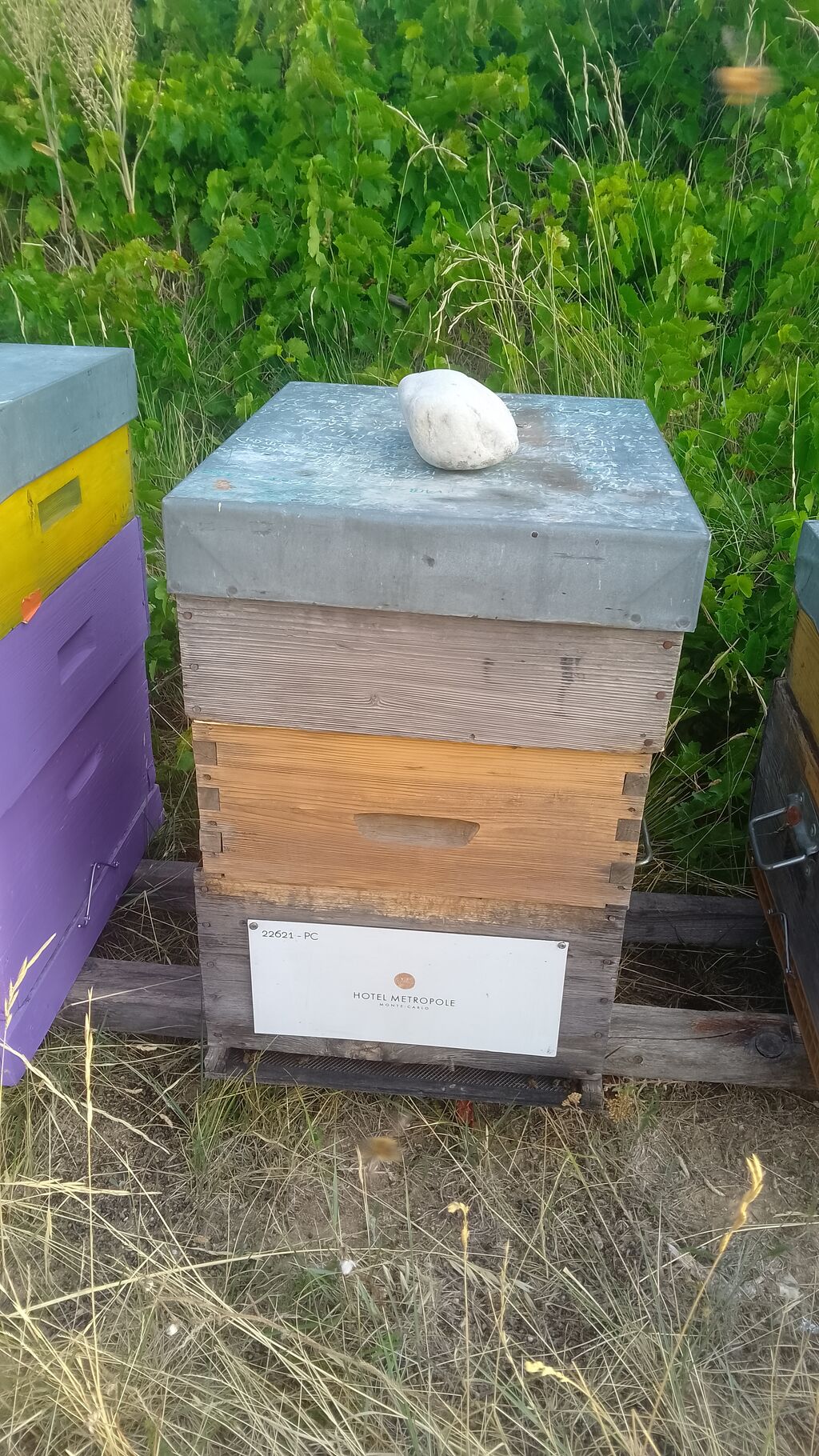 L'exploitation, la vue :-), les animaux heureux, ouverture de ruche, recherche de la reine (marquée en bleu pour 2025), recolte de miel.