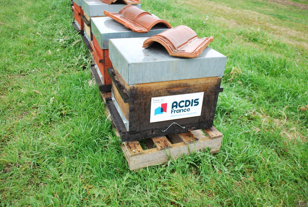 Nous avons choisi avec mon époux qui travaille le bois, de traiter l’ensemble des nouvelles ruches à l’huile de lin chaude en les baignant, les anciennes ruches sont au fur et à mesure repeintes avec une peinture à la farine mélangée à un oxyde naturel rouge. j’accorde beaucoup d’importance à la qualité du matériel.