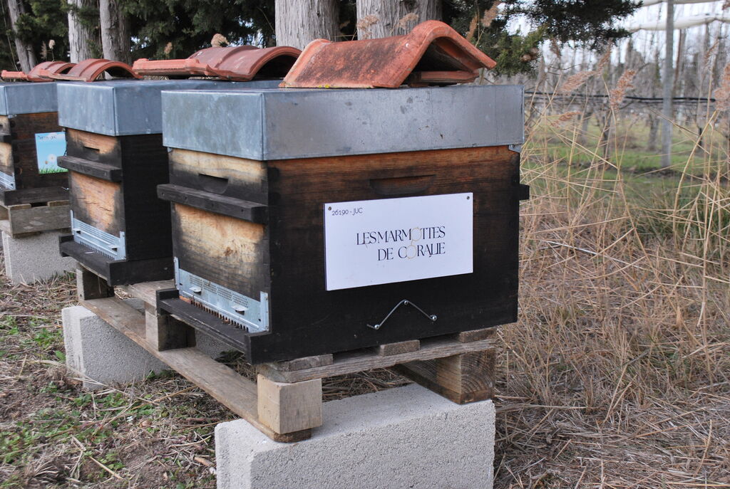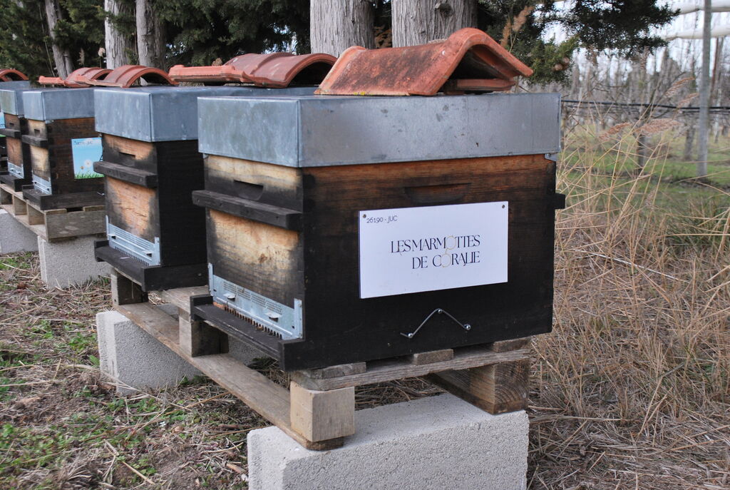 Nous avons choisi avec mon époux qui travaille le bois, de traiter l’ensemble des nouvelles ruches à l’huile de lin chaude en les baignant, les anciennes ruches sont au fur et à mesure repeintes avec une peinture à la farine mélangée à un oxyde naturel rouge. j’accorde beaucoup d’importance à la qualité du matériel.