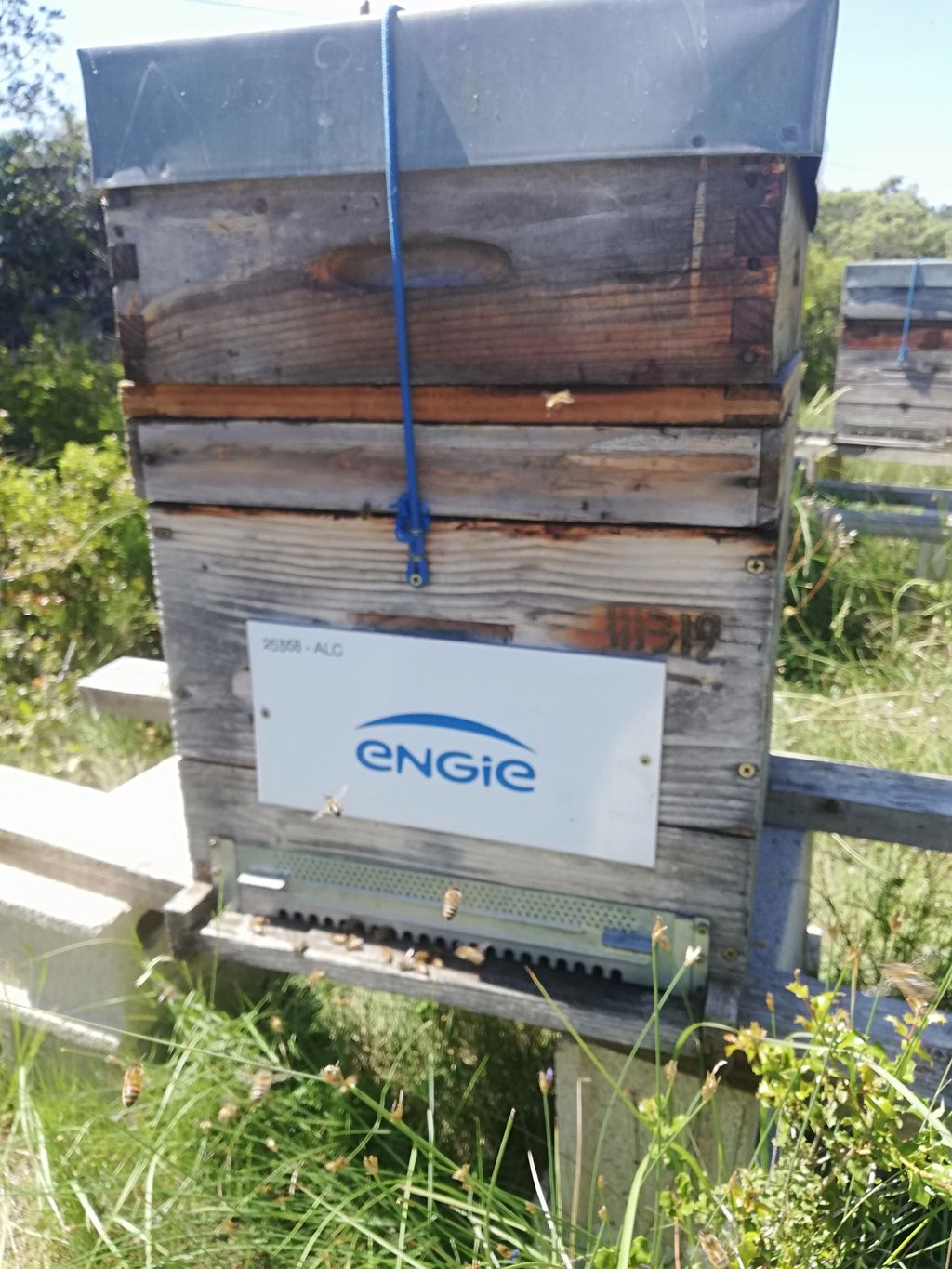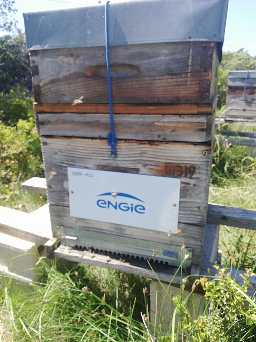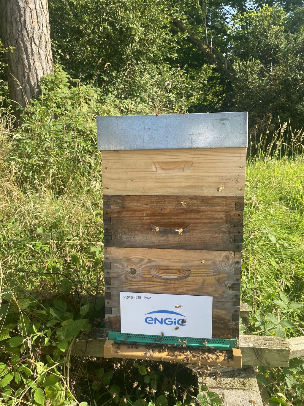 Sur cette dernière photo, on voit une ruche avec une énorme grappe d’abeilles à l’extérieur – on dit qu’elle "fait la barbe". Cela arrive juste après une récolte : ici, j’ai retiré deux hausses, et j’ai donc dû délicatement faire sortir un grand nombre d’abeilles.
