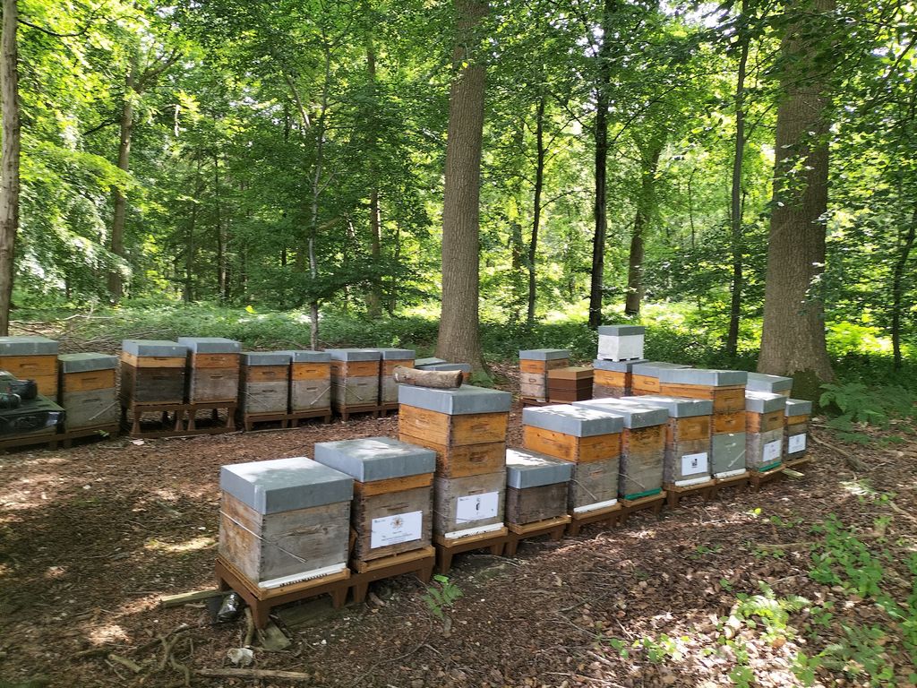 À quelques centaines de mètres se trouve également un verger d’environ 30 hectares (pommiers, poiriers, pruniers, mirabelliers), ainsi que des bois où fleurissent merisiers, aubépines, châtaigniers et ronces, offrant une belle diversité mellifère aux abeilles.