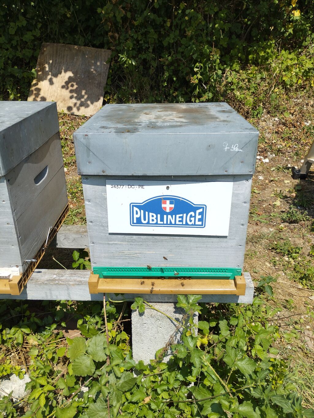 Sur cette dernière photo, on voit une ruche avec une énorme grappe d’abeilles à l’extérieur – on dit qu’elle "fait la barbe". Cela arrive juste après une récolte : ici, j’ai retiré deux hausses, et j’ai donc dû délicatement faire sortir un grand nombre d’abeilles.