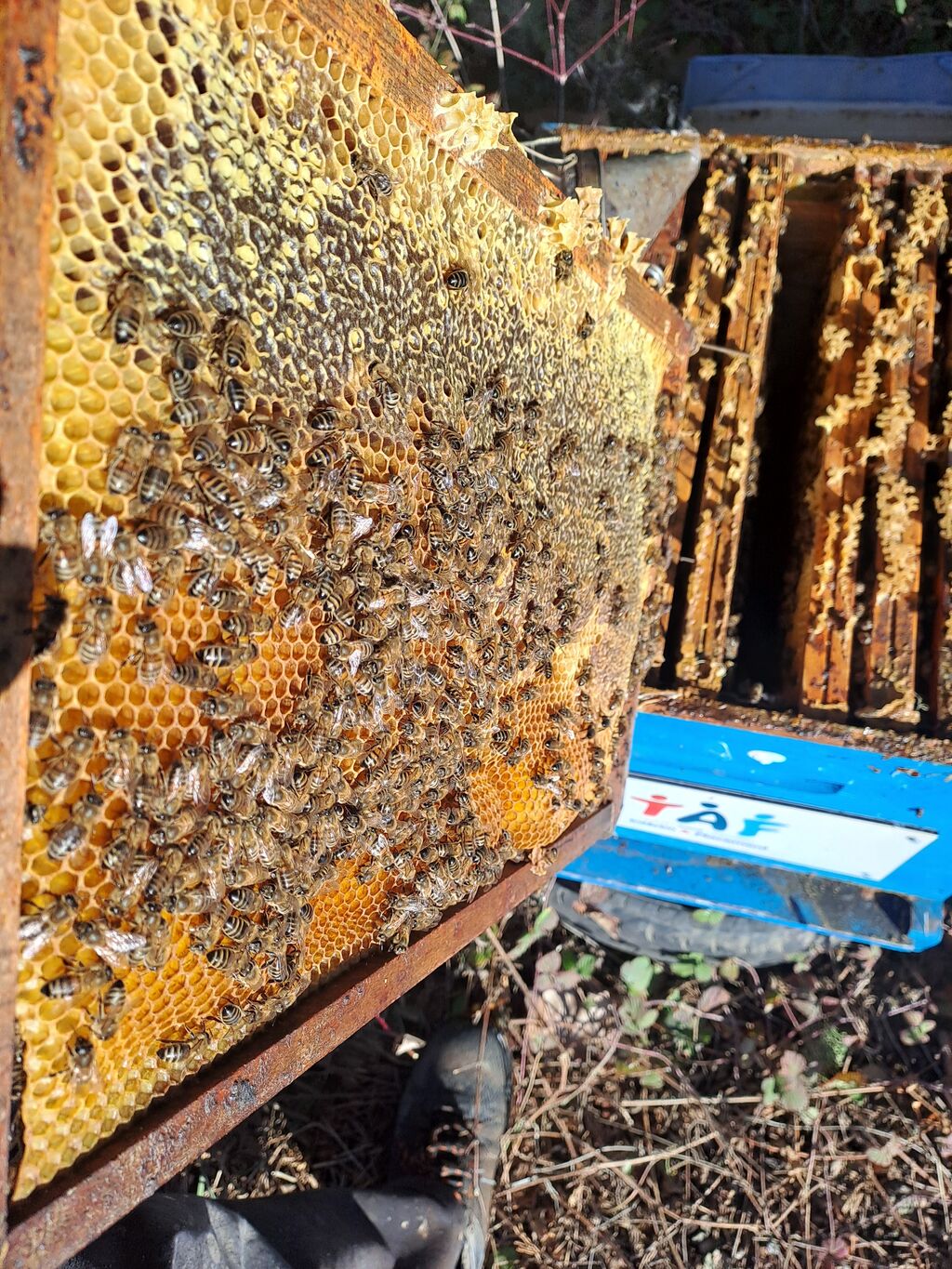 En ce moment, je prépare la saison à venir : je gratte les cadres, je tends les fils, j’insère des feuilles de cire neuve afin d’être prêt pour le printemps. Je repeins également les ruches et je range la miellerie.