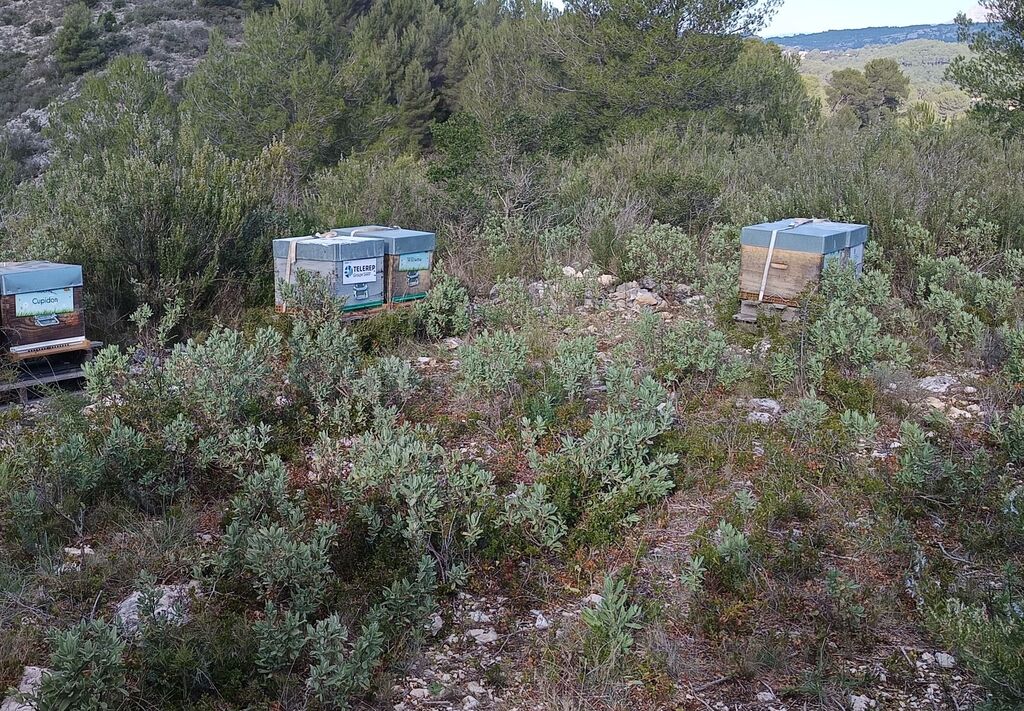 Mes ruchers d’hivernage se trouvent au pied du Garlaban, ce qui me permet, selon les années de récolter du miel de Romarin, de Thym ou de Garrigue.