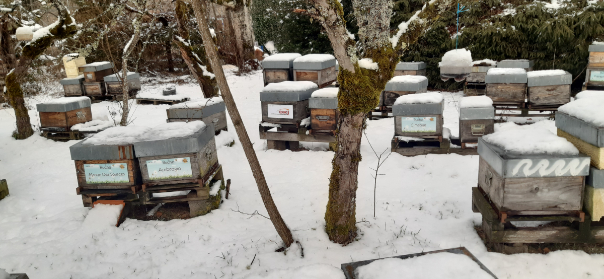 De leur côté, nos petites abeilles sont bien à l’abri dans leurs ruches. Serrées les unes contre les autres, elles forment une grappe pour conserver la chaleur et économisent précieusement leur énergie afin de passer l’hiver grâce à leurs réserves de miel.