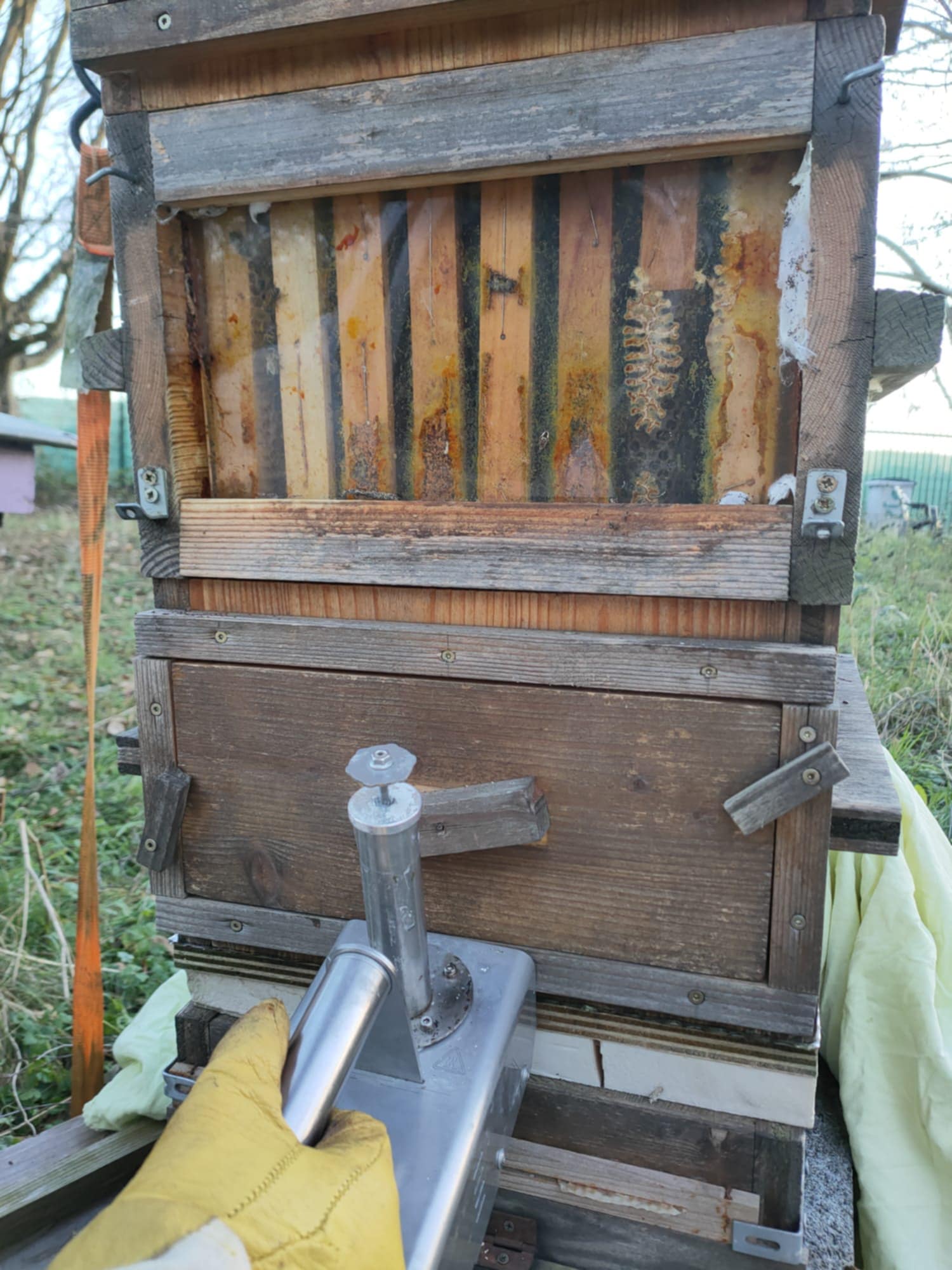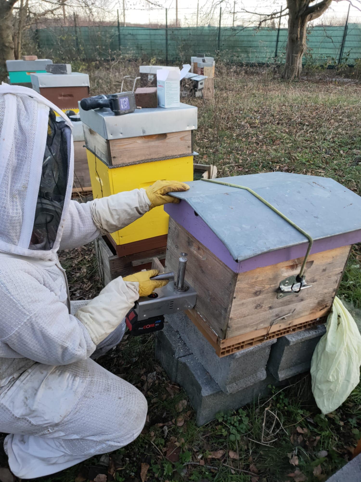 Pour ma part, j'ai choisi un traitement par vaporisation du produit dans la ruche grâce à un appareil spécifique. Nous devons porter un masque et des lunettes en plus de notre vareuse. Vous pourrez voir des photos du traitement d'hiver sur les photos jointes. C'est l'occasion de vérifier que tout le monde va bien… surtout sur les ruches possédant des vitres !!