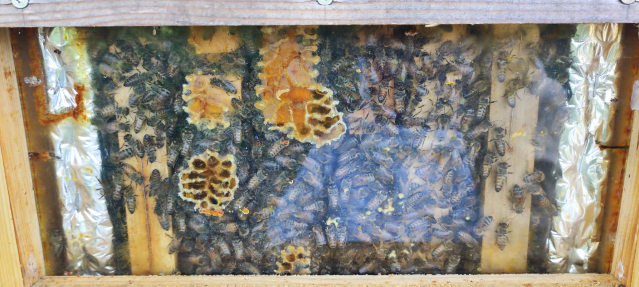 À travers la vitre, on peut voir le miel qui commence à être stocké, étant donné que l'on a une belle miellée.