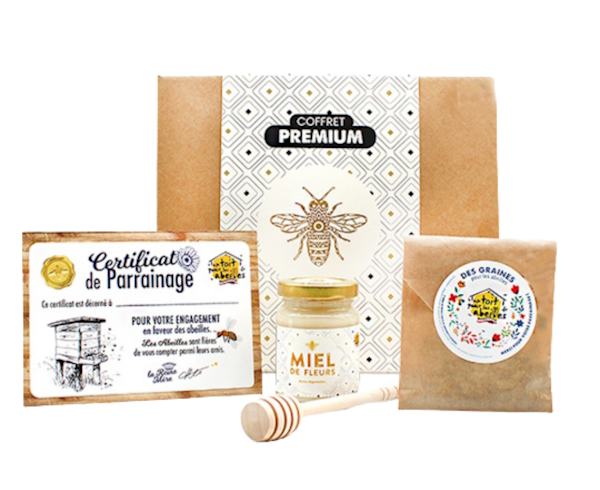 Contient un pot de miel en 125g, une cuillère en bois et un certificat de parrainage.