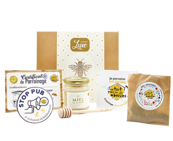 Contient un pot de miel en 250g, une cuillère en bois, un certificat de parrainage, deux autocollants et un sachet de graines mellifères à semer