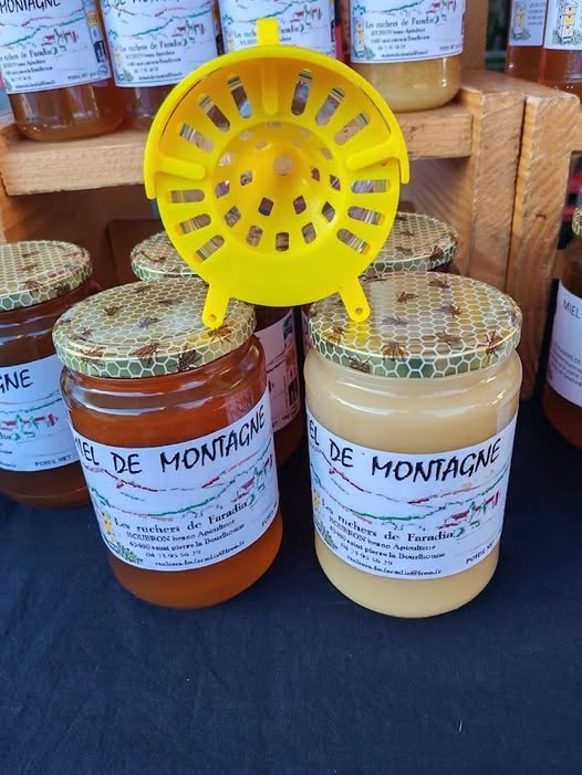 Bruno récolte divers miels de crus : Montagne, forêt, acacia , sapin et bruyère mais également pollen et propolis et fabrique du pain d'épices.